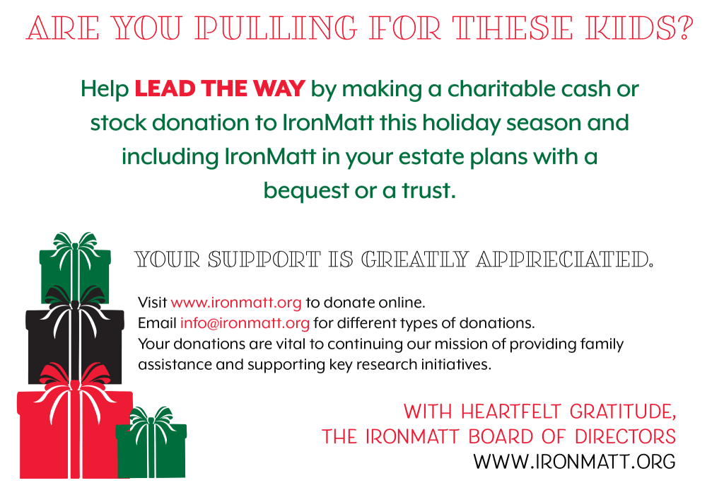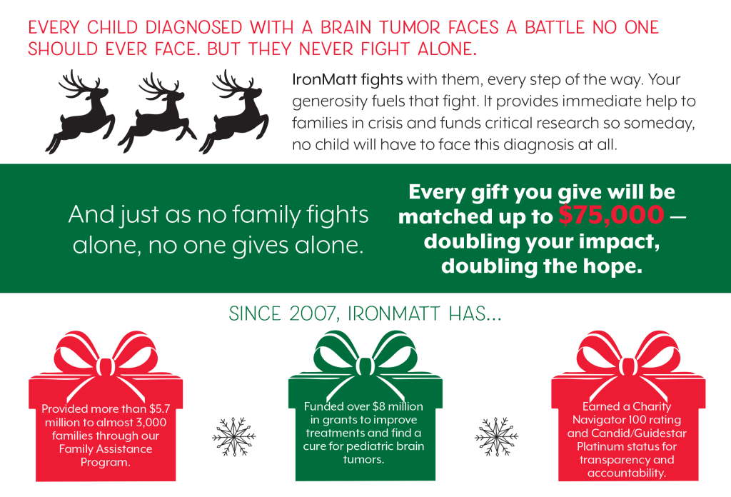 As we reflect on this past year, we are filled with gratitude for the strength of the IronMatt community — the families we serve, the supporters who stand with them, and everyone who helps ensure that no family faces a pediatric brain tumor alone.