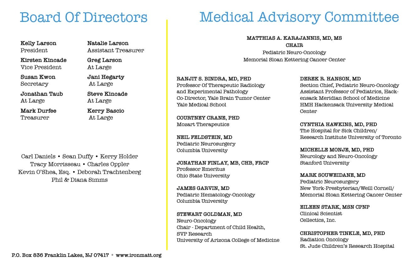 Since 2007, our Board of Directors has worked to fulfill the IronMatt mission to financially support families living with pediatric brain tumors and to fund research in the hopes of finding a cure.